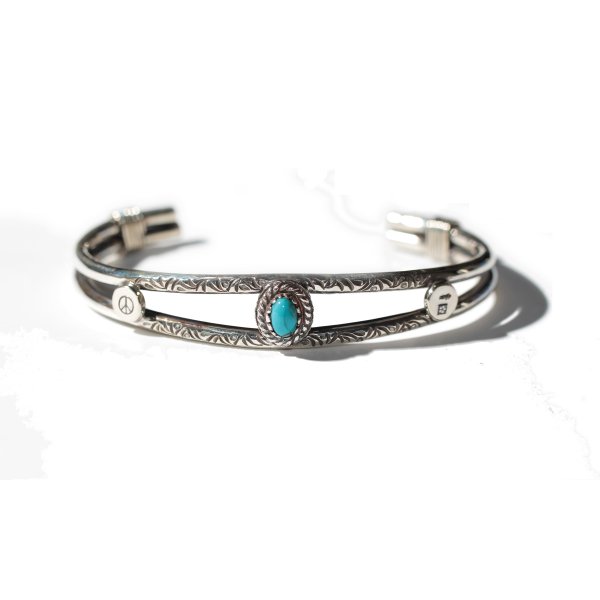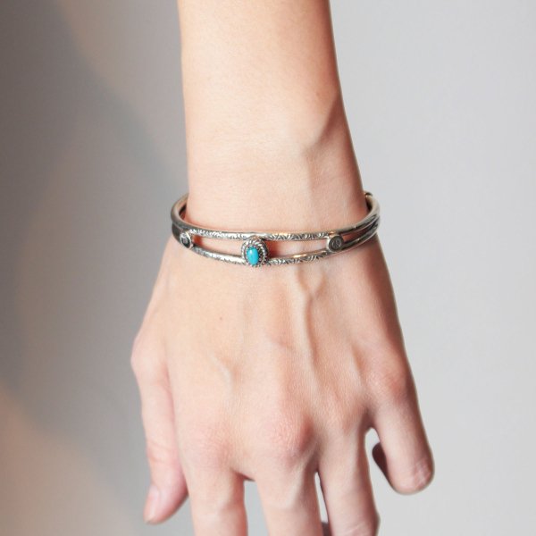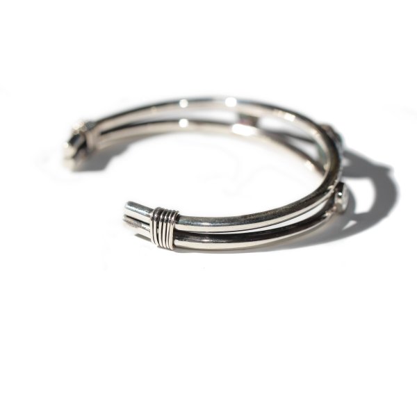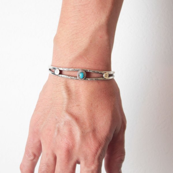 唐草模様で装飾した二本のバングルを銀線で縛り、トップスにはネイティブアメリカンスタイルの石座、その左右にロゴを配置したバングル。模様も組み立ても、型からでは起こせない、クラフト感抜群のワンメイクバングルになります。
