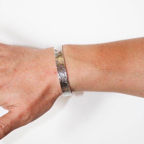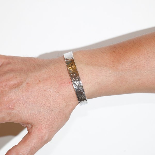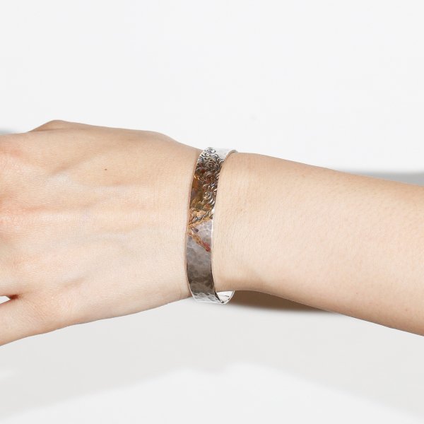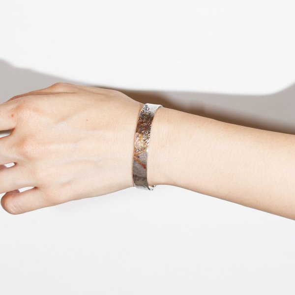 あえてバラバラにしたボディを金蝋で繋ぐ事により、繋ぎ目とその周辺にはみ出たゴールドがアクセントとなる、物を大切にする日本の心をデザインしたバングルです。一部に唐草模様を鏨にて施し、工芸感がより前面にでた逸品となります。(全て手作業で金継ぎす為、個体差があります)