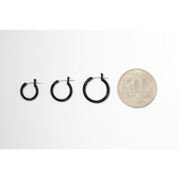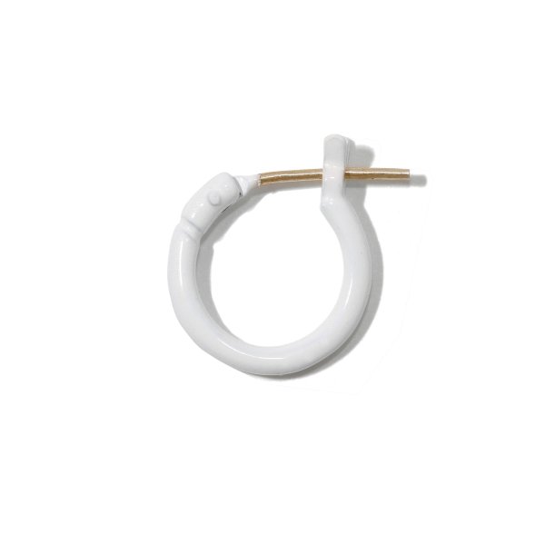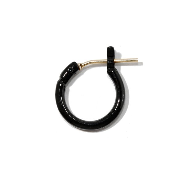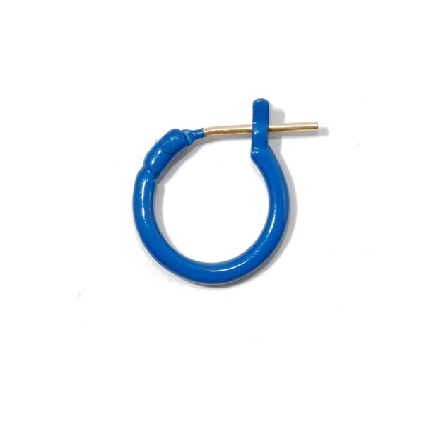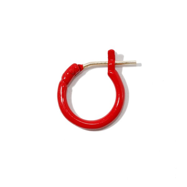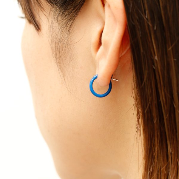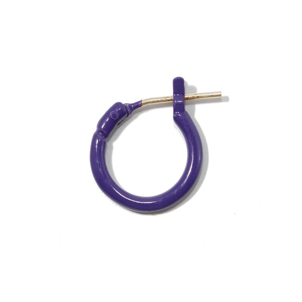 フープピアスに焼付け塗料を付着させたカラーピアスのSサイズです。耳元をポップに演出し、経年変化でエナメルが剥がれゆく味わいを、ヴィンテージのように楽しめるピアスです。開閉式のフープピアスタイプでキャッチ紛失の心配のない設計で、金属アレルギーを起こしにくいK18ゴールド製ポストを使用しています。(個人差があります)カラーは黒、白、赤、青、緑、紫の6色展開です。