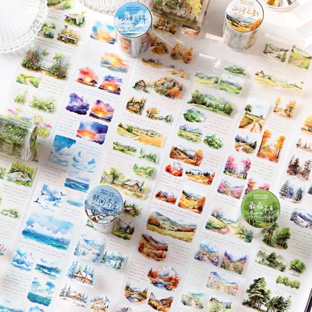 クリアテープ 幅広60mm 水彩 タッチ イラスト コラージュ素材 シール 自然風景 山林 ピクニック 小屋 ホーム 建物 青空 森林 季節 木 樹 登山 アウトドア 旅 ワイドタイプ コラージュ 素材 テープ PET 透明 英字 英語 耐水 デコレーション ハンドメイド 手帳 DIY