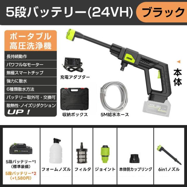 洗浄ガン本体*1、給水ホース*1、バッテリー*1、充電器*1、クイックコネクタ*1、調節ノズル*1、自吸式フィルター*1、バブルポット*1、収納ケース*1
