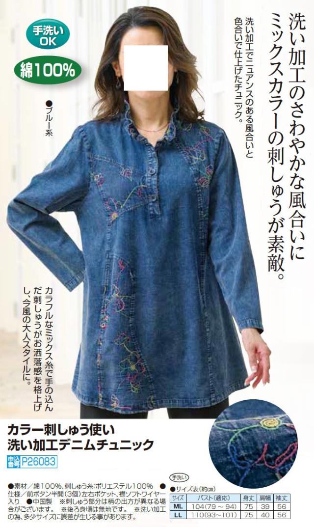 チュニック コットン 長袖 デニム ブルー レディース カラー刺しゅう使い洗い加工デニムチュニック 婦人服 ミセス シニア 女性 刺繍 花柄 プルオーバー 青 シンプル かわいい シニアファッション 40代 50代 60代 70代 80代 母の日 お母さん おばあちゃん 秋冬 nss p26083