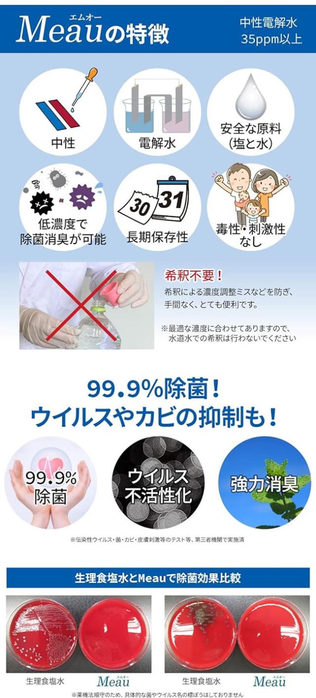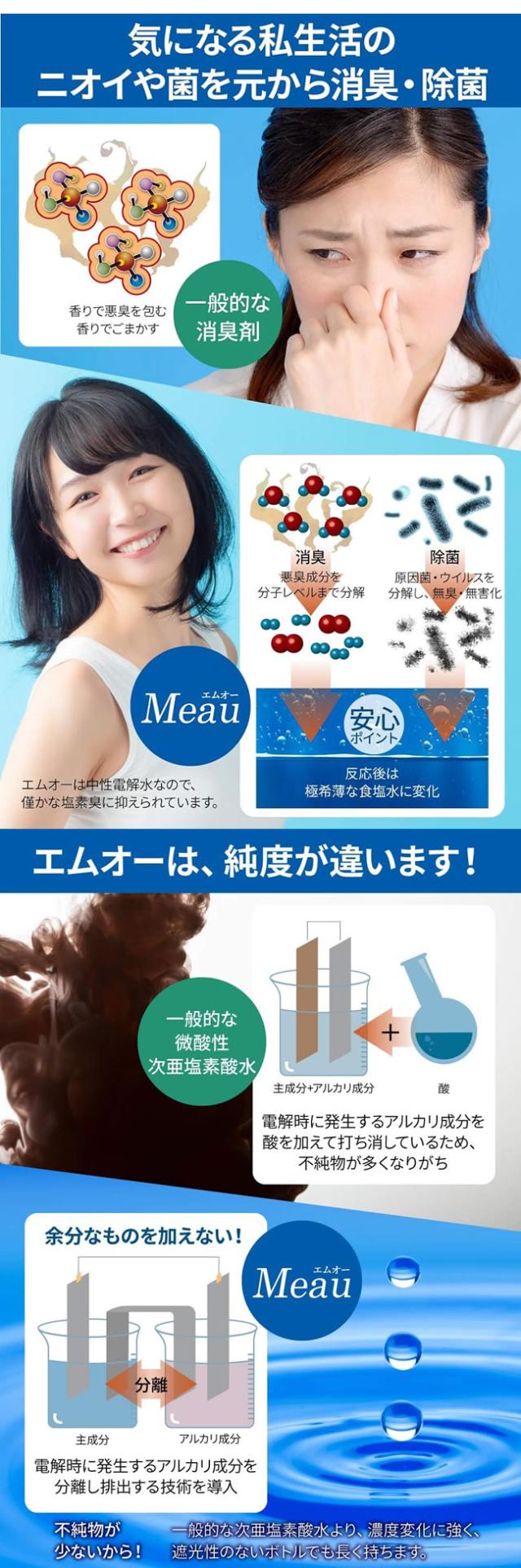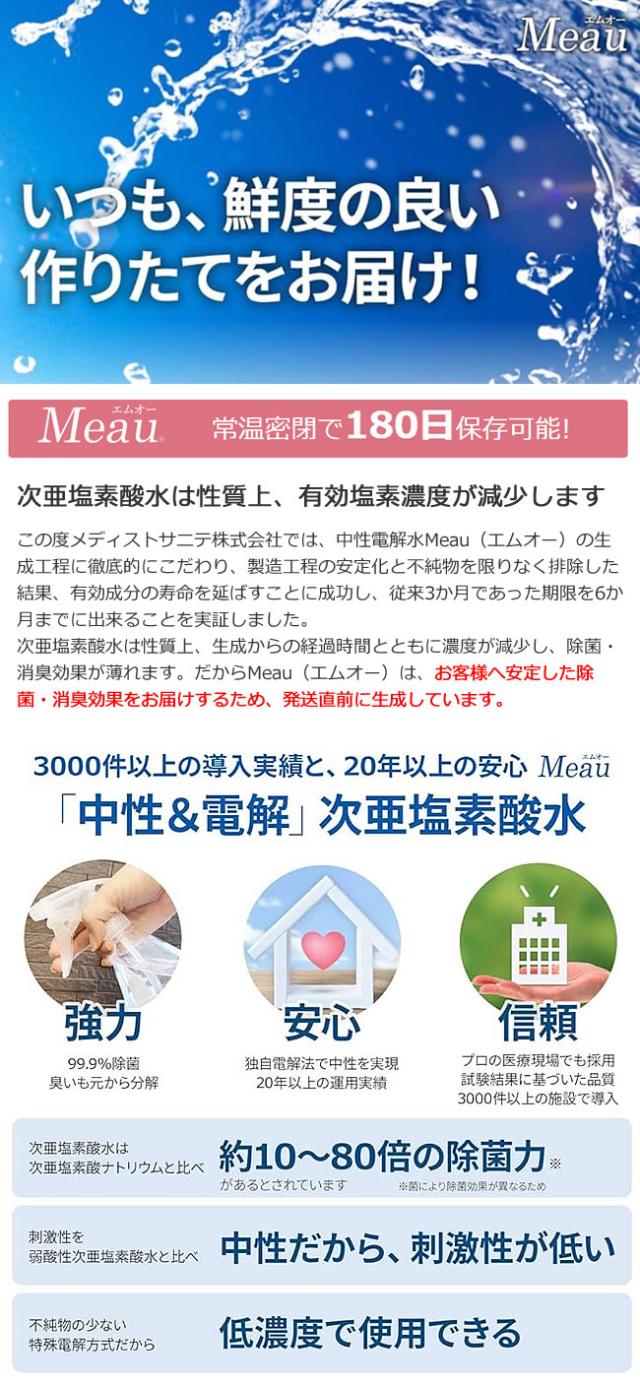 ・「Meau(エムオー)」は、除菌消臭水として医療分野をはじめ、動物病院や水族館、ペットショップなど全国3000件以上の実績があります。