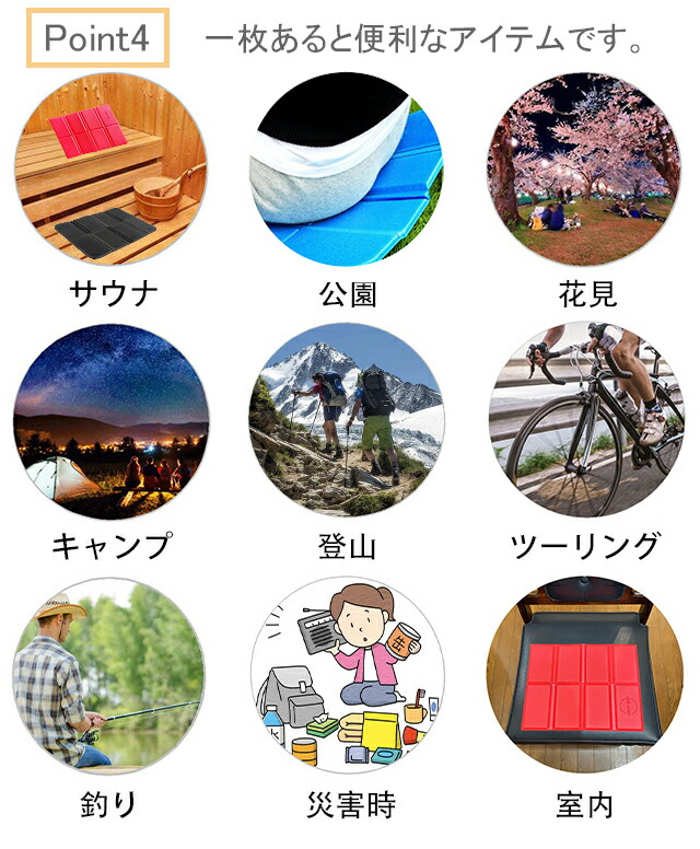 ・サウナ、公園、花見、キャンプ、登山、ツーリング、釣り、災害時、室内など
