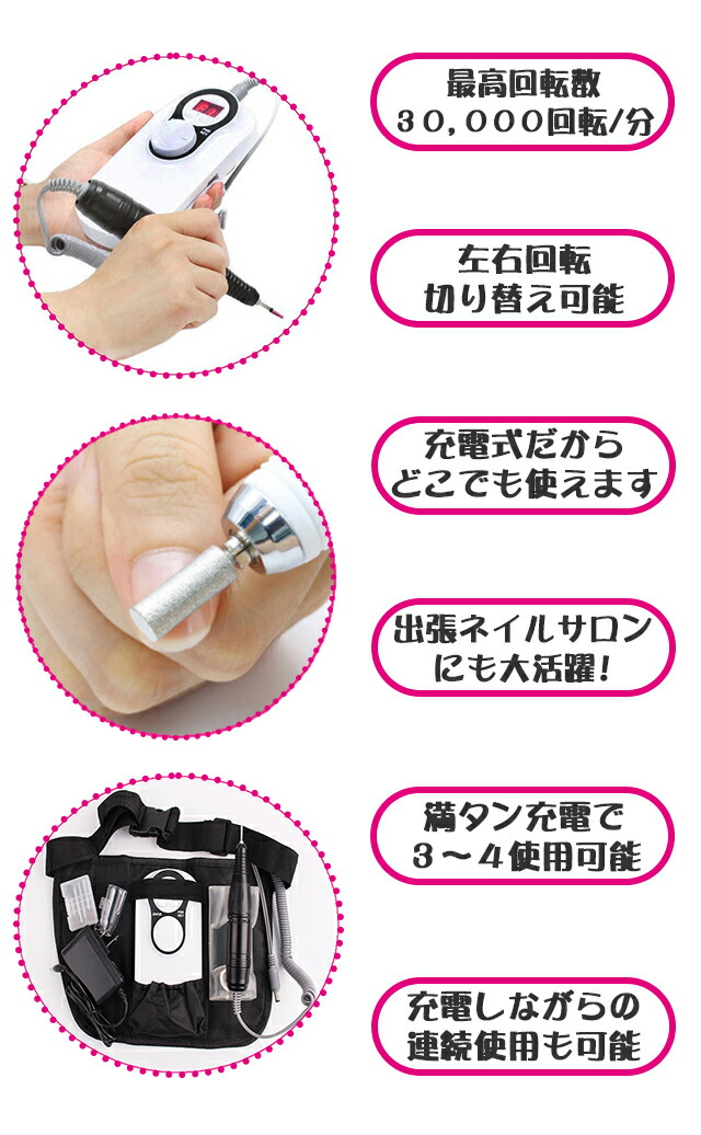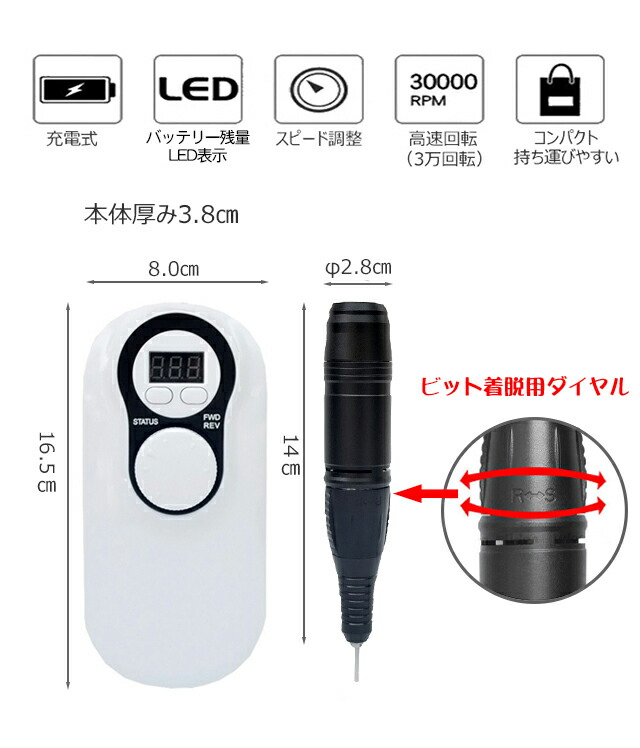 ・回転数の調節が可能、便利なコンパクトな充電式ネイルケアマシーンです。