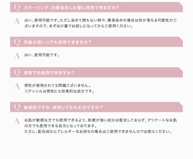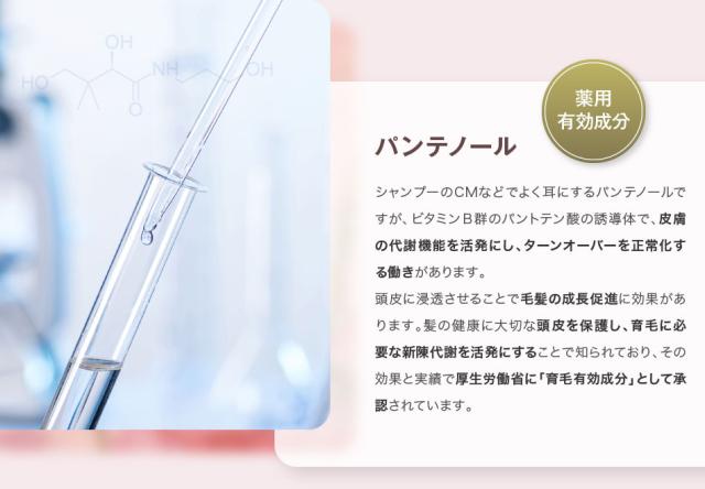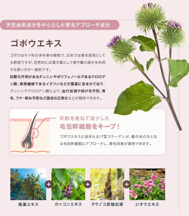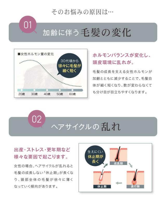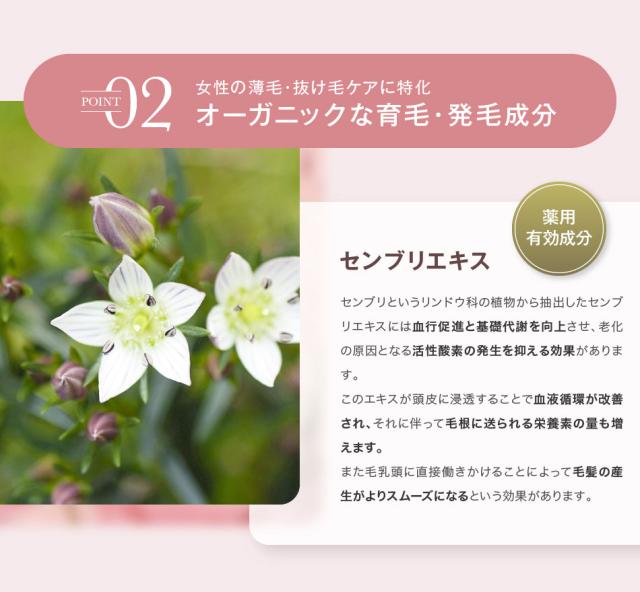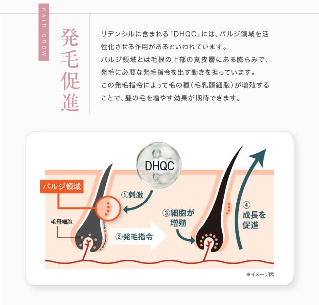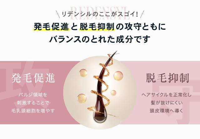 ●育毛・発毛効果の高い「リデンシル」を女性向けに1%配合。 女性用育毛剤では聞き慣れない成分だと思いますが、男性用の高級育毛剤の一部で使用されている、セイヨウアカマツ球果エキスなど4つの天然由来成分からなる非常に育毛・発毛効果の高い成分がリデンシルです。100%天然由来成分なので女性のデリケートな頭皮にも安心してご利用いただける成分です。