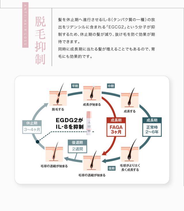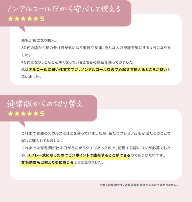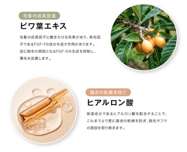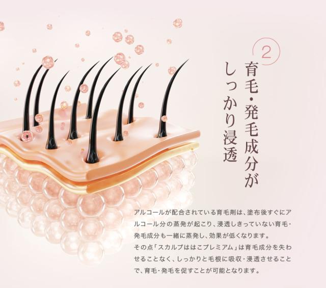 ●アルコール成分不使用なので、育毛成分がアルコールと一緒に蒸発することがなく、育毛・発毛有効成分が頭皮にしっかり浸透。またアルコール成分により頭皮が極度に乾燥することがないため、頭皮の乾燥によるフケ、髪の毛のパサつき、赤み、かゆみ、腫れを防ぎます。またアルコールアレルギーの方にも安心してお使いいただけます。