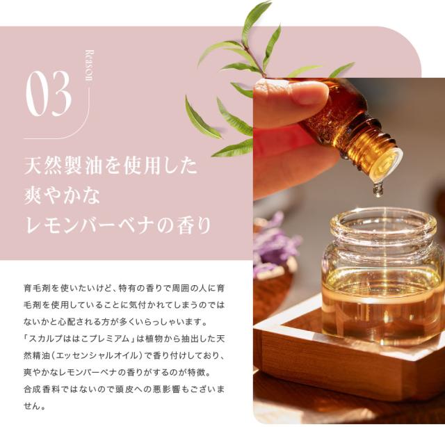 ●スカルプははこプレミアムには植物から抽出した天然精油(エッセンシャルオイル)で香り付けしており、爽やかなレモンバーベナの香りがするのが特徴です。