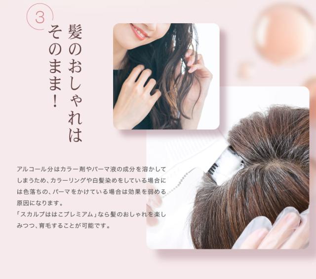 ●女性に優しいアルコールフリー(ノンアルコール、アルコール度数0%)の育毛剤です。 アルコール不使用なので、パーマ、カラー、白髪染めをされている女性でも、脱色やパーマ効果を弱まらせることなくご使用いただけます。