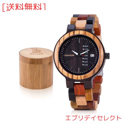 ?【ユニークな手作り腕時計】KINGNOWクォーツ腕時計のベルト部分は黒檀、アフリカ・サンダルウッド、ゼブラウッド、カエデなどの天然木材から組み立てられています。木材の表面は丁寧に磨かれていて、なめらかな感触があります。ベルトに癒しの高い天然木を使って使い込むほどに手の脂と摩擦により、竹肌が濃い、深みのある艶やかな色に変化していきます。