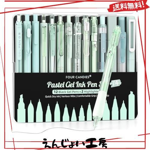 Four Candies ジェルボールペンセット 可愛いノート型ゲルペン 0.5mm12本ボールペン&2本蛍光ペン かきやすい 速乾性インク 学校 ノート