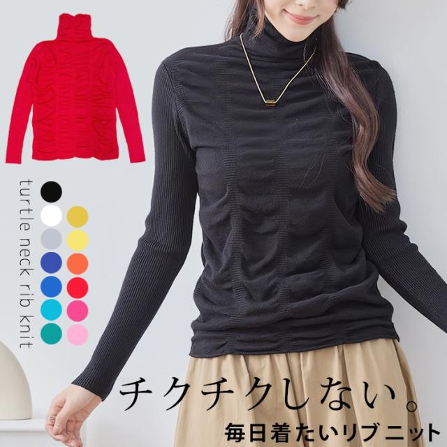 トップス レディース 秋 ニット 長袖 きれいめ 薄手 ハイネック ニット タートルネック セーター インナー リブニット 秋冬 タートル ちくちくしない ニットトップス ギャザー シャーリング デザイン おしゃれ シンプル ベーシック 40代 50代 60代 グレー 黒 赤 レッド 白