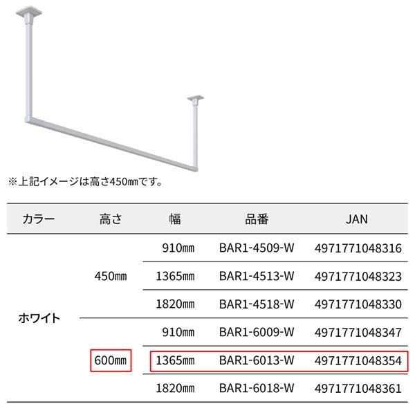 商品仕様: BAR1-6013-W ホスクリーン 固定式室内物干 BAR型 ホワイト 白 高さ 600mm×幅 1365mm