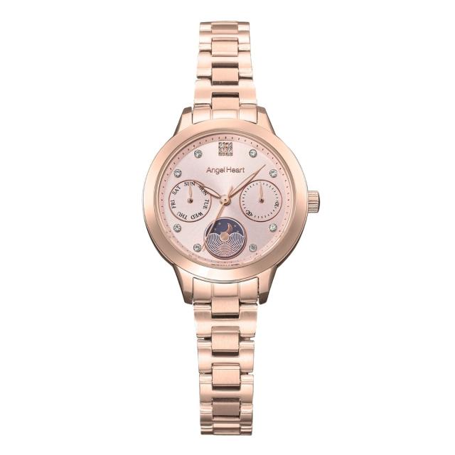 6時位置には時間の経過とともに月と太陽が姿を現すサン&ムーン機能を搭載。また曜日・日付表示も搭載しており、実用的なのも嬉しいポイント。