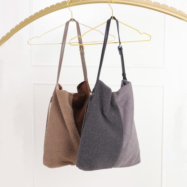 バイカラーデザインが特徴のムートン風素材の縦長トートバッグ。