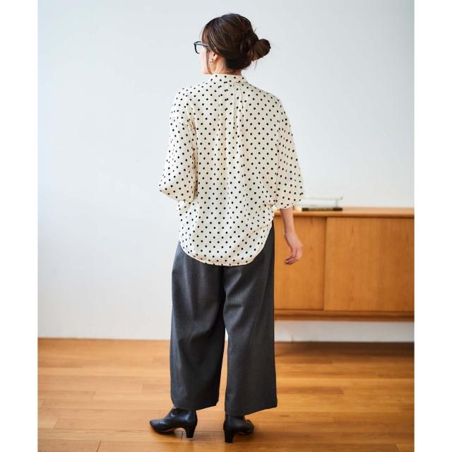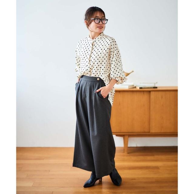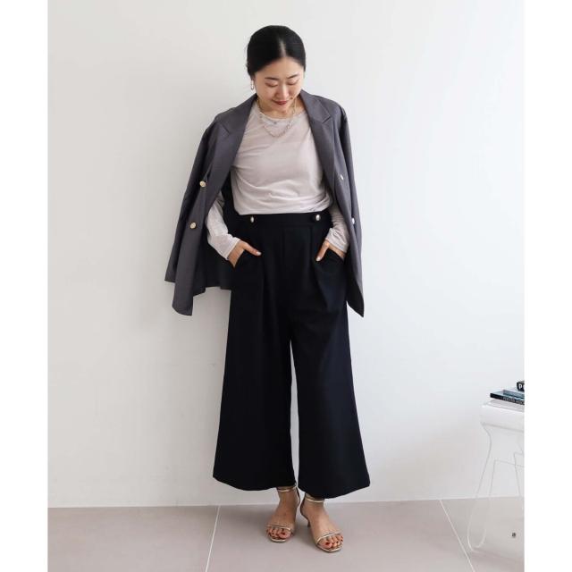 シルエットはややワイドなので、着やせ効果も◎ウエストはゴールドの釦で、華やかさをプラス。