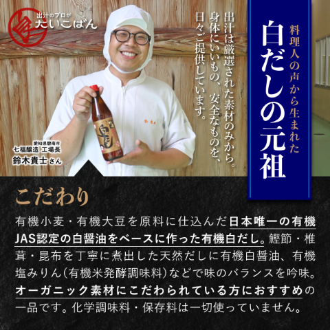有機小麦・有機大豆を原料に仕込んだ日本唯一の有機JAS認定の白醤油をベースに作った有機白だし。 鰹節・椎茸・昆布を丁寧に煮出した天然だしに有機白醤油、有機塩みりん(有機米発酵調味料)などで味のバランスを吟味。 オーガニック素材にこだわられている方におすすめの一品です。 化学調味料・保存料は一切使っておりません。