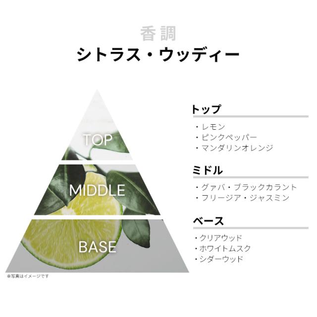 レモン、マンダリン・オレンジ、ピンクペッパーなどが、すがすがしいシトラス・スパイシーを香り立たせるトップから、