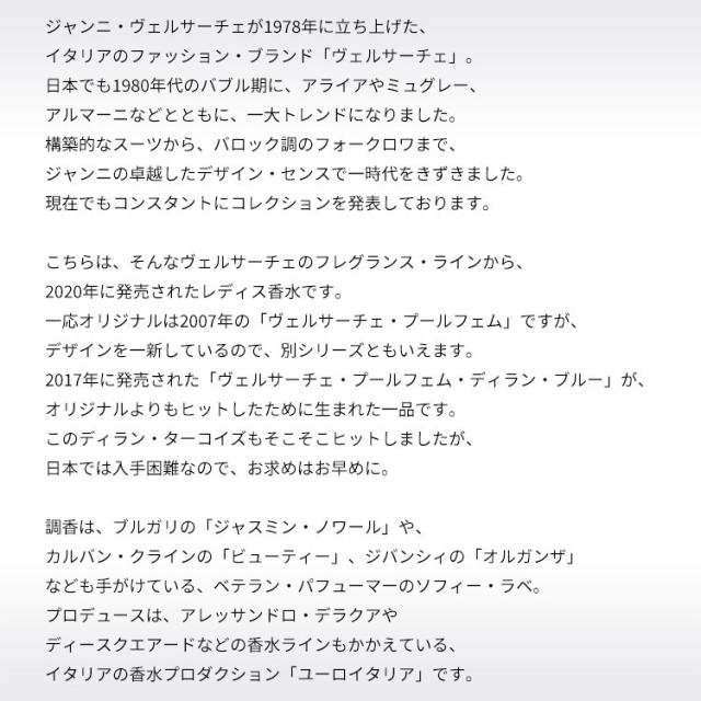 一応オリジナルは2007年の「ヴェルサーチェ・プールフェム」ですが、デザインを一新しているので、別シリーズともいえます。2017年に発売された「ヴェルサーチェ・プールフェム・ディラン・ブルー」が、オリジナルよりもヒットしたために生まれた一品です。