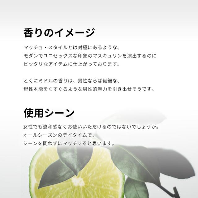 プロダクトは「D&G」や「アレッサンドロ・デラクア」などの香水を手掛ける「EUROITALIA」。とくにミドルの香りは、男性ならば繊細な、母性本能をくすぐるような男性的魅力を引き出せそうです。女性でも違和感なくお使いいただけるのではないでしょうか。オールシーズンのデイタイムで、シーンを問わずにマッチすると思います。清涼飲料水の瓶のようなボトルはユニークで、よく知られております。