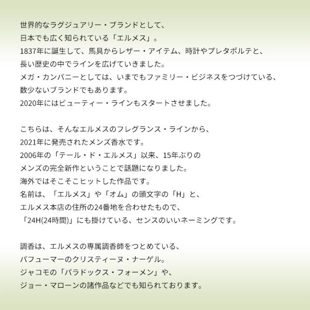 こちらは、そんなエルメスのフレグランス・ラインから、2021年に発売されたメンズ香水です。2006年の「テール・ド・エルメス」以来、15年ぶりのメンズの完全新作ということで話題になりました。海外ではそこそこヒットした作品です。