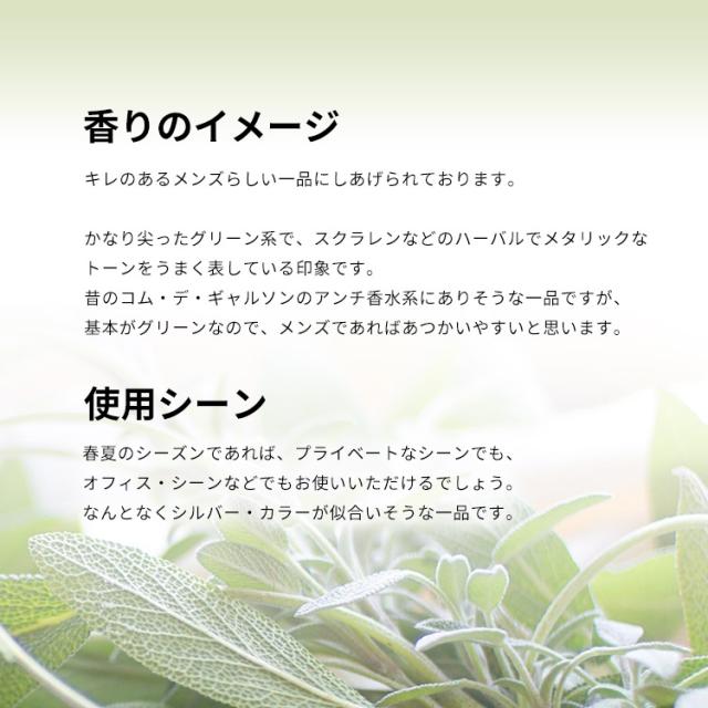 かなり尖ったグリーン系で、スクラレンなどのハーバルでメタリックなトーンをうまく表している印象です。むかしのコム・デ・ギャルソンのアンチ香水系にありそうな一品ですが、基本がグリーンなので、メンズであればあつかいやすいと思います。