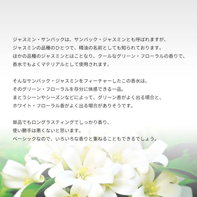 ジャスミン・サンバックは、サンバック・ジャスミンとも呼ばれますが、ジャスミンの品種のひとつで、精油の名前としても知られております。ほかの品種のジャスミンとはことなり、クールなグリーン・フローラルの香りで、香水でもよくマテリアルとして使用されます。