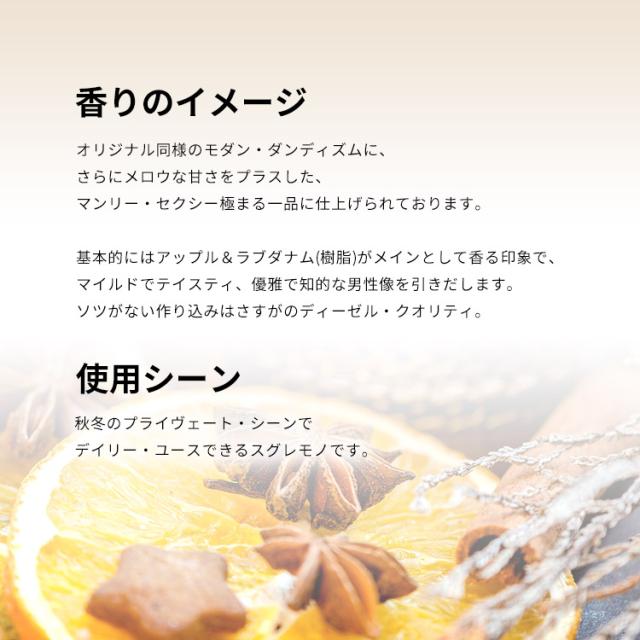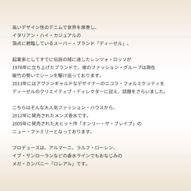 プロデュースは、アルマーニ、ラルフ・ローレン、イブ・サンローランなどの香水ラインでもおなじみのメガ・カンパニー「ロレアル」です。基本的にはアップル&ラブダナム(樹脂)がメインとして香る印象で、マイルドでテイスティ、優雅で知的な男性像を引きだします。ソツがない作り込みはさすがのディーゼル・クオリティ。秋冬のプライヴェート・シーンでデイリー・ユースできるスグレモノです。