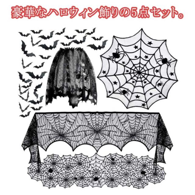 ハロウィン 飾り 5点セット テーブルクロス レース ランプシェード 暖炉カバー クモ 蜘蛛 コウモリ お化け 飾り付け ハロウィンパーティー デコレーション 室内 部屋 インテリア 雑貨 送料無料