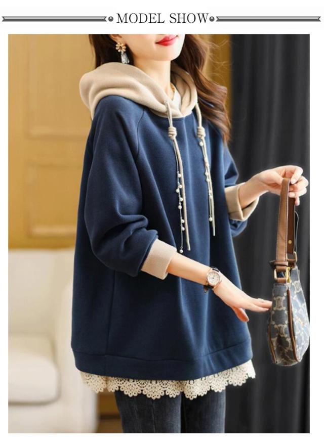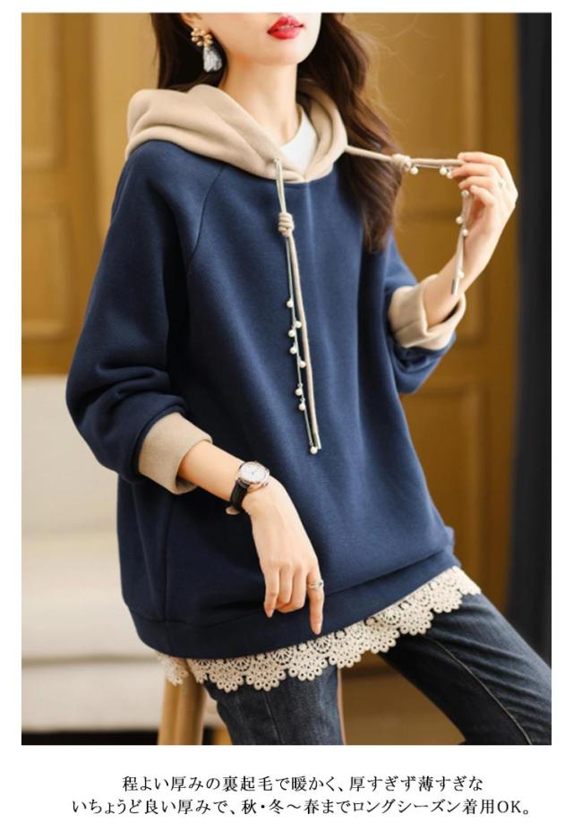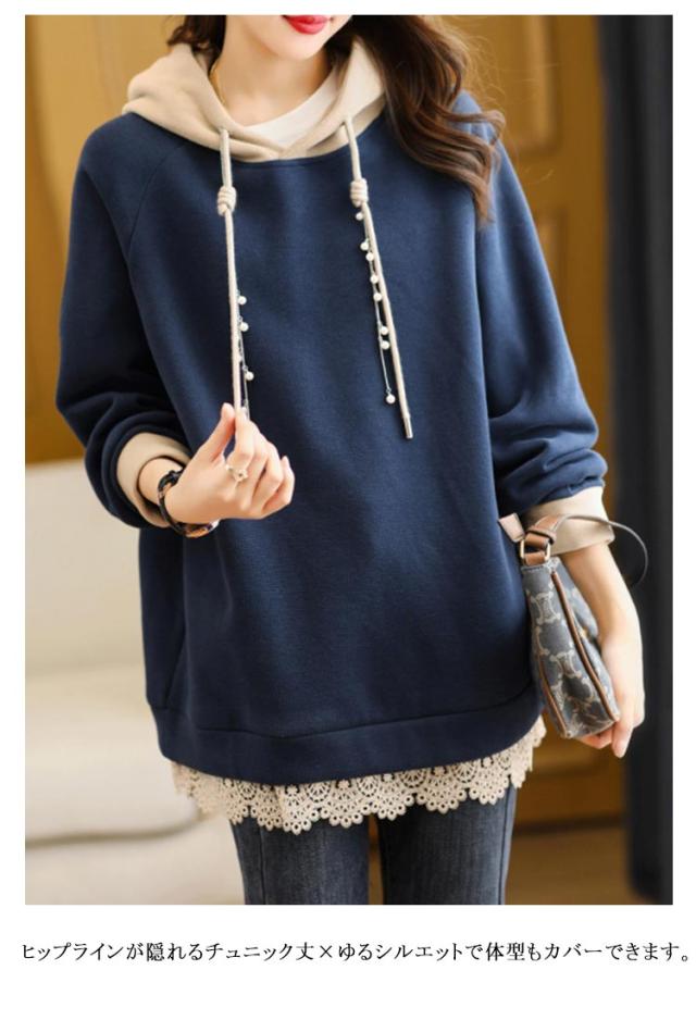 トレーナー パーカー おしゃれ フード付き レディース スウェットパーカー 防寒 裏起毛 レース パール 大人 可愛い パーカー トップス 大きいサイズ 体型カバー カジュアル あったか 春 秋 冬 M〜4XL