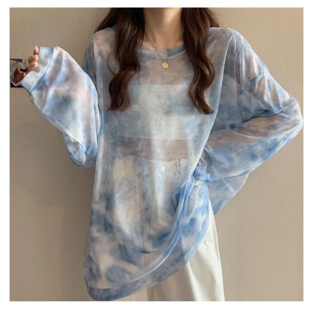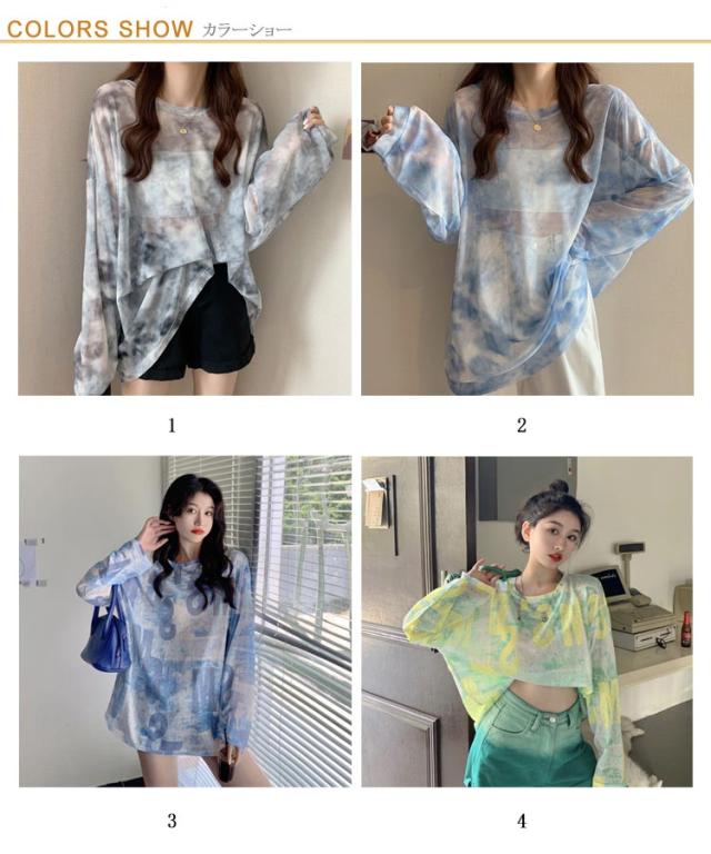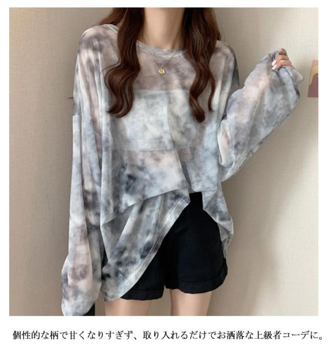 送料無料 シアートップス 長袖タイダイ柄シアーシャツ チュニック 透け感 カットソー シアーブラウス シースルー ロンT ラウンドネック レイヤード 肌着 下着 重ね着 インナー 薄手 きれいめ 秋 春 夏
