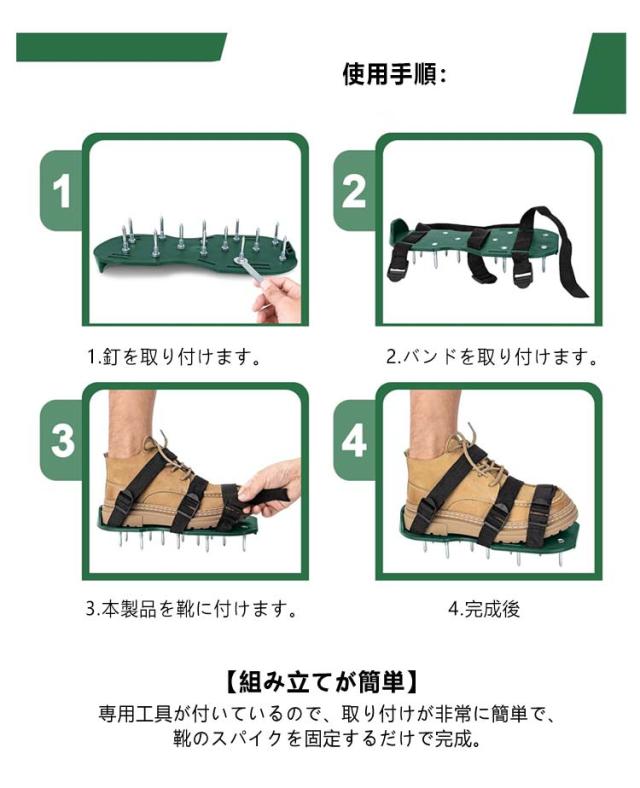 | 芝生を健全な状態に維持! 裝着簡単! 芝スパイク 【 ガーデンスパイク】履いて歩くだけ芝生の穴あけ作業が簡単に芝生のお手入れに重要な穴あけ作業。複雑な機器や多額の費用に投資する必要はありません。ガーデンスパイク履い芝生の上を体重をかけながらゆっくり歩くだけ。足の裏のスパイクで穴あけが簡単にできます。歩くだけで穴あけ作業ができるので、とっても簡単。面倒な芝生のメンテナンスラクラクになります。 【効果】土に穴をあけ空気を送り、土壌微生物を活性化 、土の軟化 、保水性や通気性の向上 ・芝生を適度に傷めて成長を活性化し、発根促進 ・古い根を切る 芝生を綺麗に保つ事ができます。 【ロックバックル付き】簡単装着ロックバックル採用、26個の58mmの頑丈なステンレス製釘で設計されており、空気、水、栄養素がより深く到達するように、深い土壌に簡単かつ迅速に打ち込むことができます。通気性のある健康的な芝生を手に入れることはかつてないほど容易になります。 【フリーサイズ】男女兼用、3つのバンドで大きさを簡単に調整可能、幅も調整可能な設計になっております。ほとんどの足のサイズに最適です。 【組み立てが簡単】専用工具が付いているので、取り付けが非常に簡単で、靴のスパイクを固定するだけで完成。 使用手順: 1.釘を取り付けます。 2.バンドを取り付けます。 3.本製品を靴に付けます。 4.完成後 | |