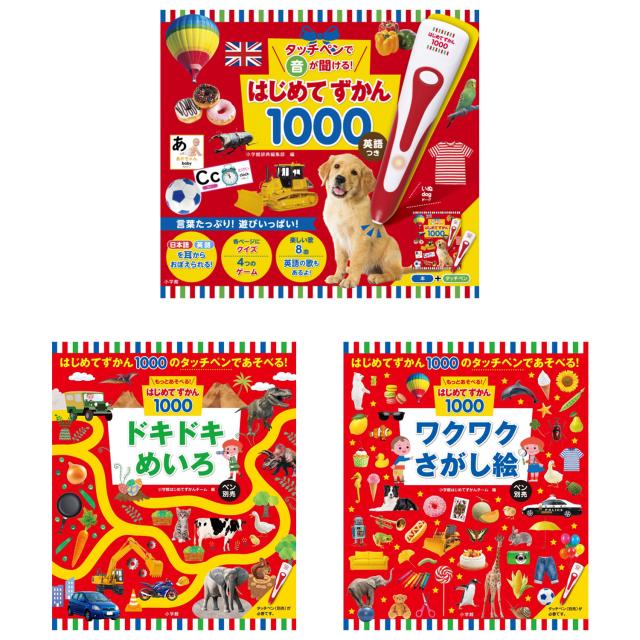 タッチペンで音が聞ける!はじめてずかん1000 英語つき と もっとあそべる!はじめてずかん1000 ドキドキめいろ ペン別売 と もっとあそべる!はじめてずかん1000 ワクワクさがし絵 ペン別売 をセットにしてご紹介!