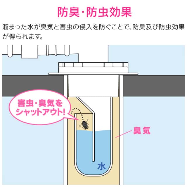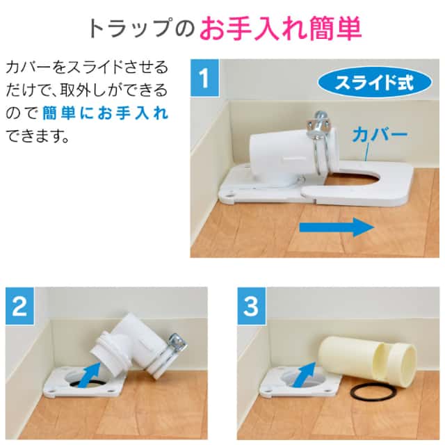 ◆トラップ構造で臭気と害虫の侵入を防ぐことができます。◆カバーをスライドさせるだけで取外しができるので、掃除が簡単です。