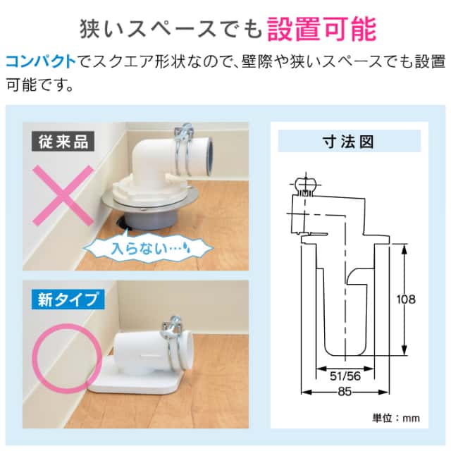 洗濯機パンが取り付けられない場所に、床に直接施工できる排水トラップです。
