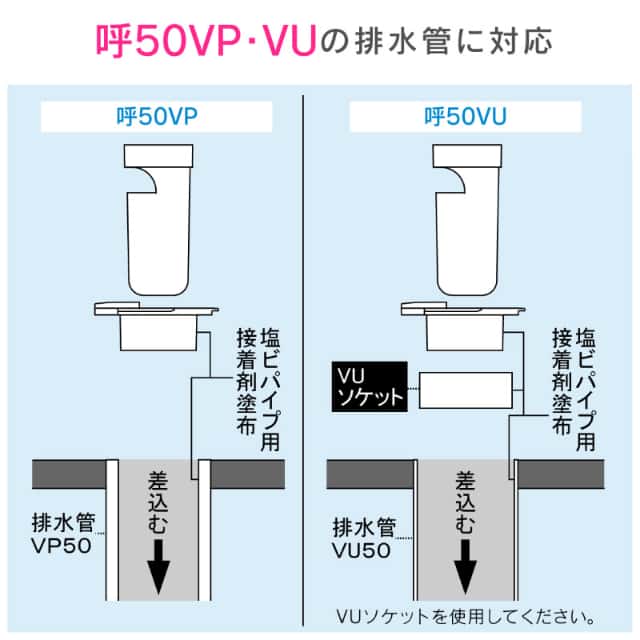 ◆呼び50のVP・VU管に接続できます。(パイプの適合サイズ内径51ミリまたは56ミリ)