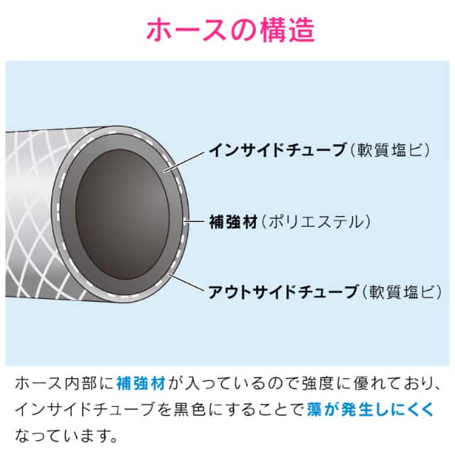 ◆2層構造と補強材の使用により折れにくく、しなやかなホースです。