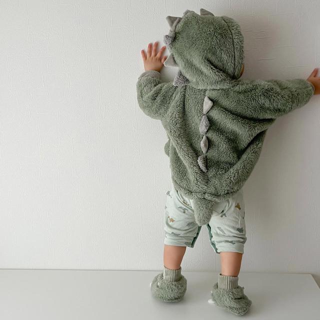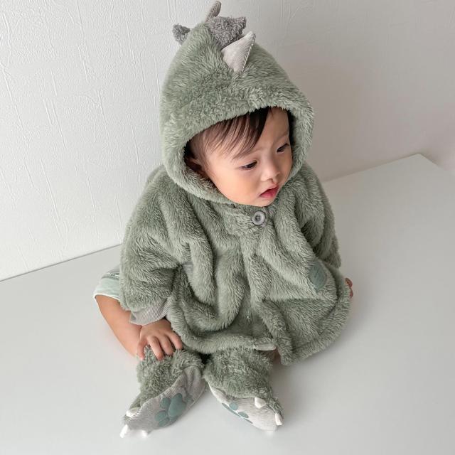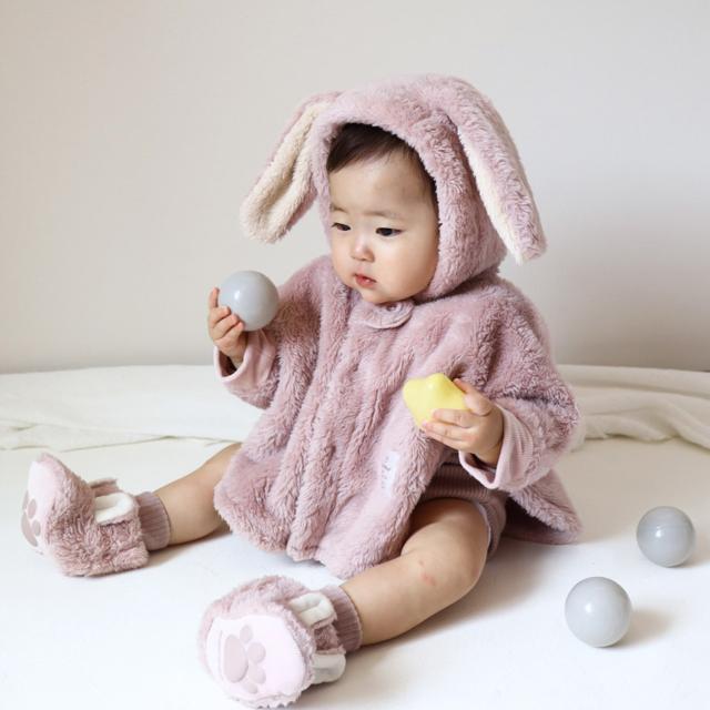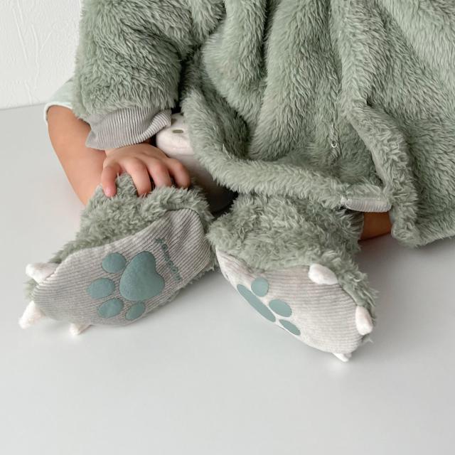 あったかモコモコ生地のアニマルベビーブーティです。? 足裏にはぷっくりした足型の滑り止めプリント付き。 ベビーカーなどでの移動の時、さっと履かせて足元の防寒にも。