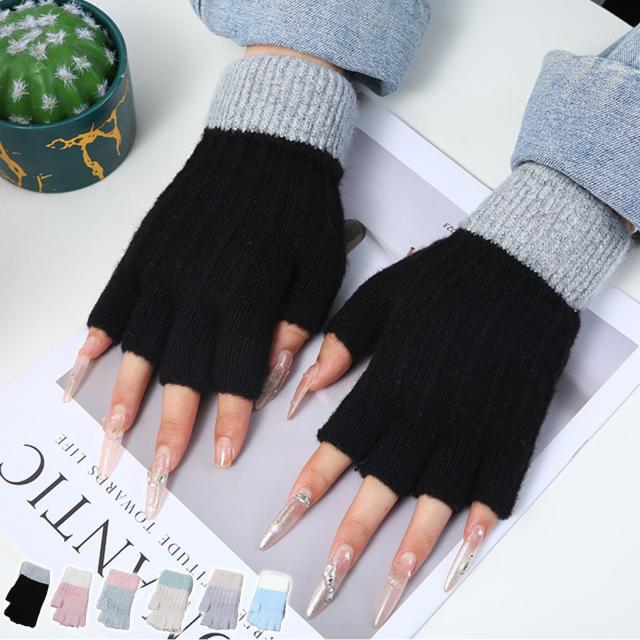 手袋 レディース 暖かい 手ぶくろ てぶくろ グローブ スマホ対応 パソコン 指なし 防寒 寒さ対策 裏起毛 ニット ハンドウォーマー 手首 リブ 配色 カラーブロック デイリー 普段使い 通勤 OL 通学 学生 自転車 クリスマス 誕生日