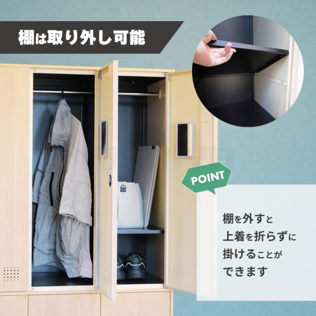 ●6人用のハンガーパイプ付きスチールロッカーです ●スチール製で耐久性があり、木目調でインテリア性も兼ね備えています ●塗料を含まない木目転写技術を使用し、環境にも配慮 ●ロッカーは鍵付きでプライバシーを守ることができ、防犯面も安心 ●1つの扉ごとに専用鍵が2本付属します ●扉には閉める音や傷を防止するクッション付きで、熱やにおいを逃がす通気口もあります ●鏡付きで、荷物を置くついでに身だしなみを整えることもできます(2段階調整可能) ●棚板付きで収納力アップ!取り外し可能で使い勝手も抜群です ※お客様での組み立てが必要な商品です(プラスドライバーが必要です) 関連商品はこちらをクリック 品番:SR6Y-M |