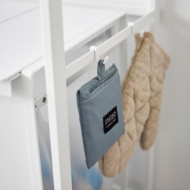 ミトンやキッチン周りの小物を引っ掛けておけるフックが4個付属しています。左右のバーに簡単に取り付けでき、お好みの位置に付けることができます。