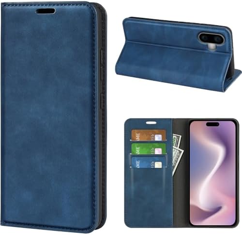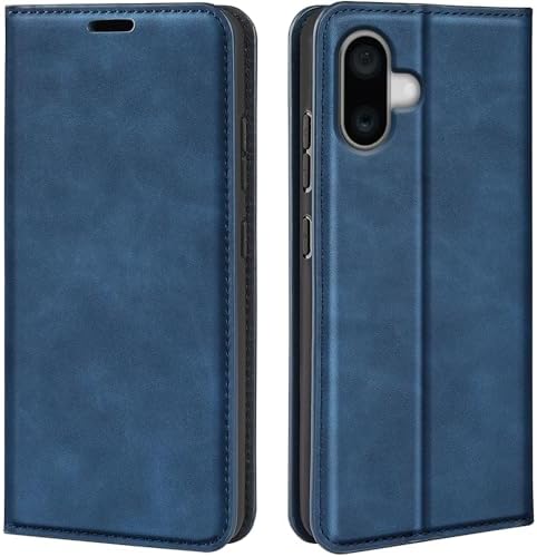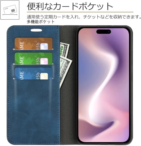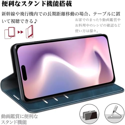iPhone 16 ケース 手帳型 カバー 財布型 内蔵マグネット開閉式 ベルトなし 落ち着いた色 カードポケット 折り畳み式 横置き スタンド機能 便利 耐衝撃 青