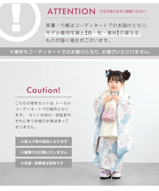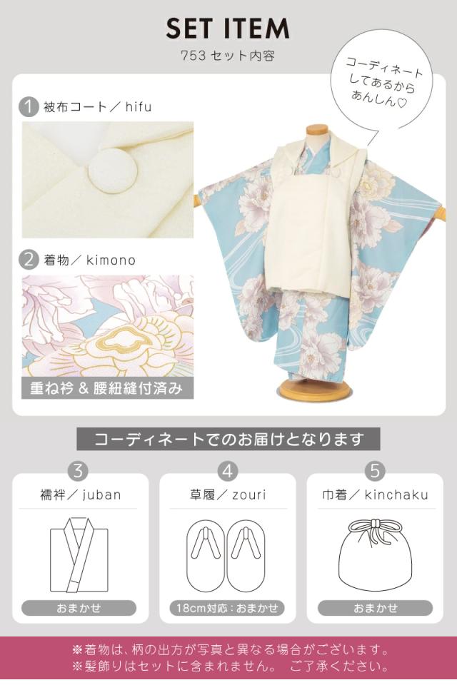 きもの館SOUBIENのプライベートブランド『floro by SOUBIEN』(フローロ)から女の子の七五三やお宮参りにおすすめな女児用の被布着物セットです。
