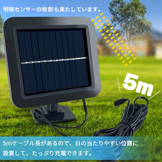 【分離式のソーラーパネル】従来のソーラーライトと比較して、ソーラーパネルをライト本体から分離しています。付属の5m防水ケーブルを使用して、日当たりの良い場所にソーラーパネルを設置できます。日中は電力を節約し、夜は長くて明るい高輝度の光を生成します。