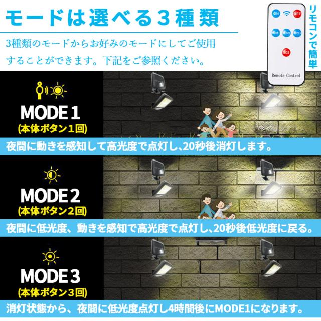 このソーラーセキュリティライトにはお好みで変更できる3つの照明モードがあります。