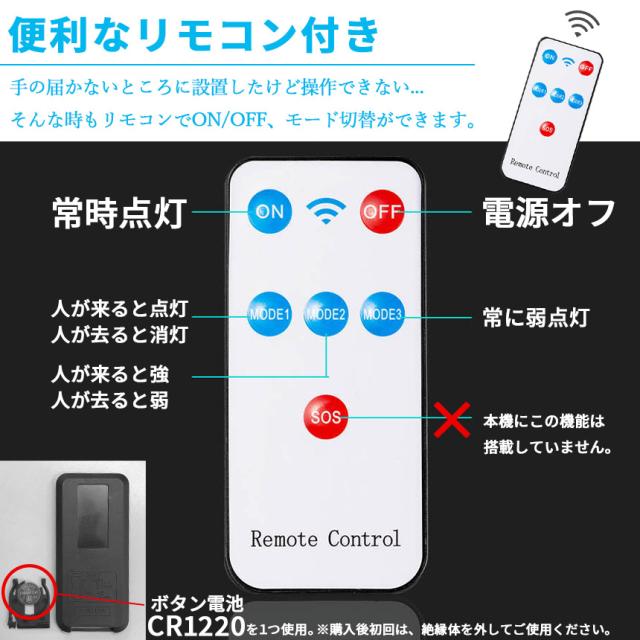 ライト正面の緑色のボタンでも操作可能ですが、高いところに設置してすぐ操作できない...そんな時も便利なリモコンで簡単に電源ON/OFFやモード変更ができます。