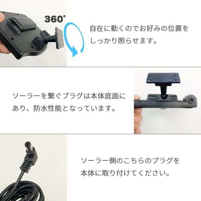 ※ソーラーを繋ぎますと、ソーラー部分が明暗センサーとして機能しますので、明るいところで試していてライトが付かない!?といったことがありますが、ソーラー部分を手でふさぐなどして暗くしてからお確かめください。本機は暗所で発光するライトです。(ソーラーを外した状態ですと、充電が明るいところでも使用できます。)