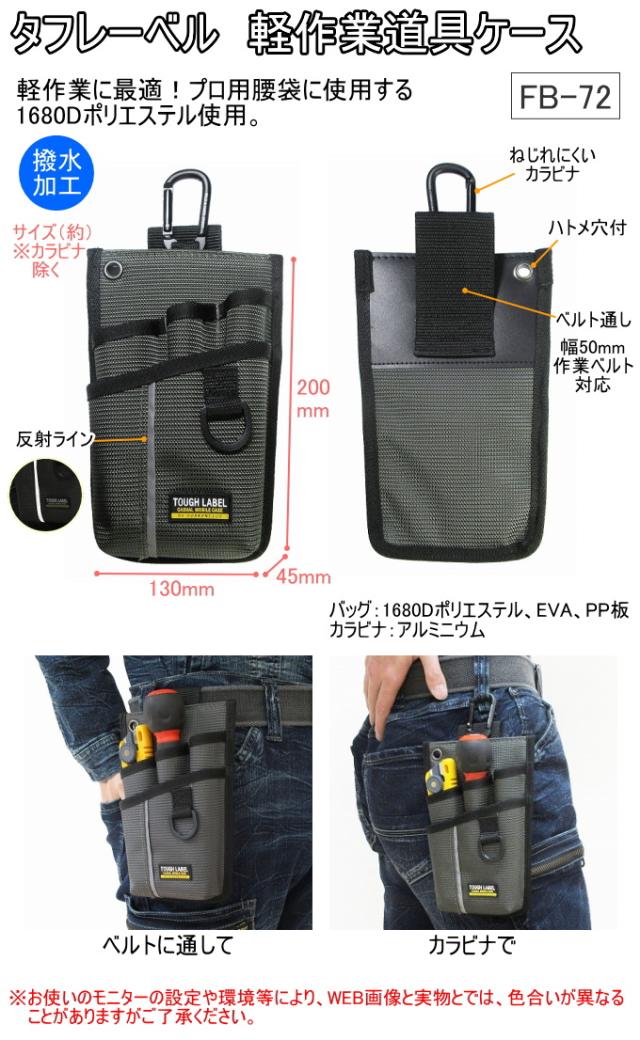 タフレーベル 軽作業道具ケース FB-72 バッグ バック ポーチ 携帯小物入れ 腰袋 作業ポーチ 工具差し 作業道具入れ 小物入れ 収納 1680Dポリエステル使用 撥水加工 反射ライン付 カラビナ付 ベルト通し 50mm幅 カーキ 中林製作所 冒険倶楽部