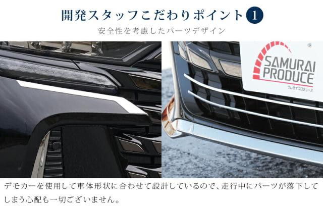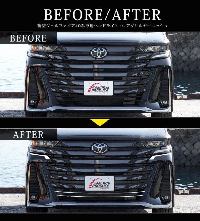 トヨタ新型ヴェルファイア40系専用設計のフロントロアグリルとヘッドライト下部に装着するメッキモールのセットです。