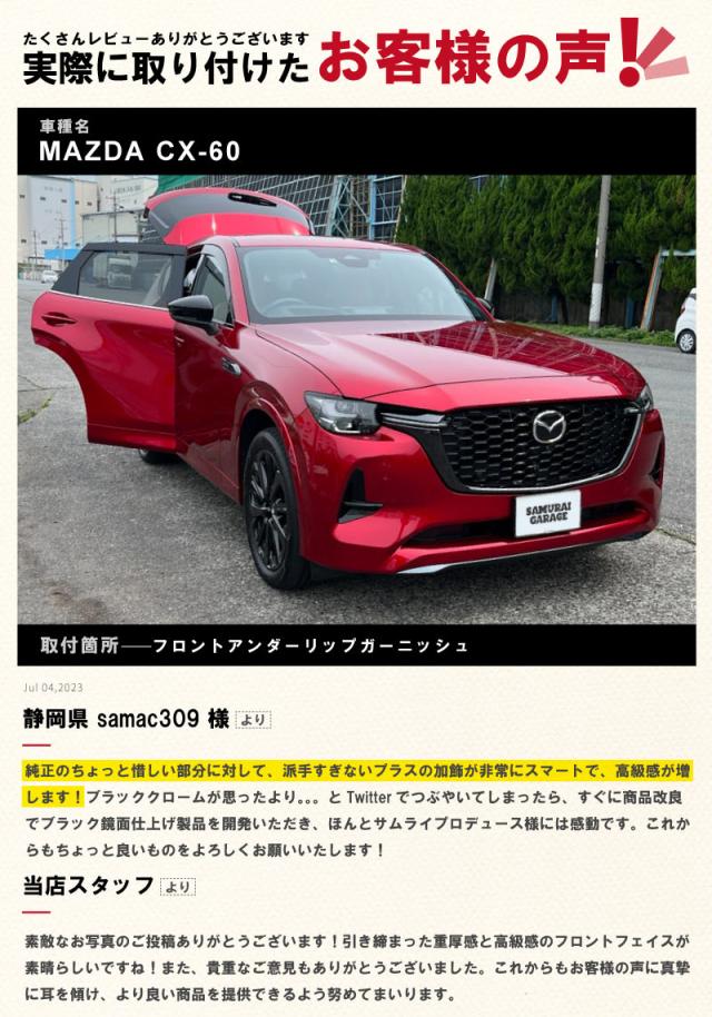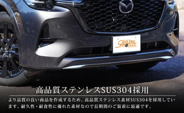 CX-60(ハイブリッド・PHEV)専用設計のフロントマスクの下部に装着するメッキパーツです。